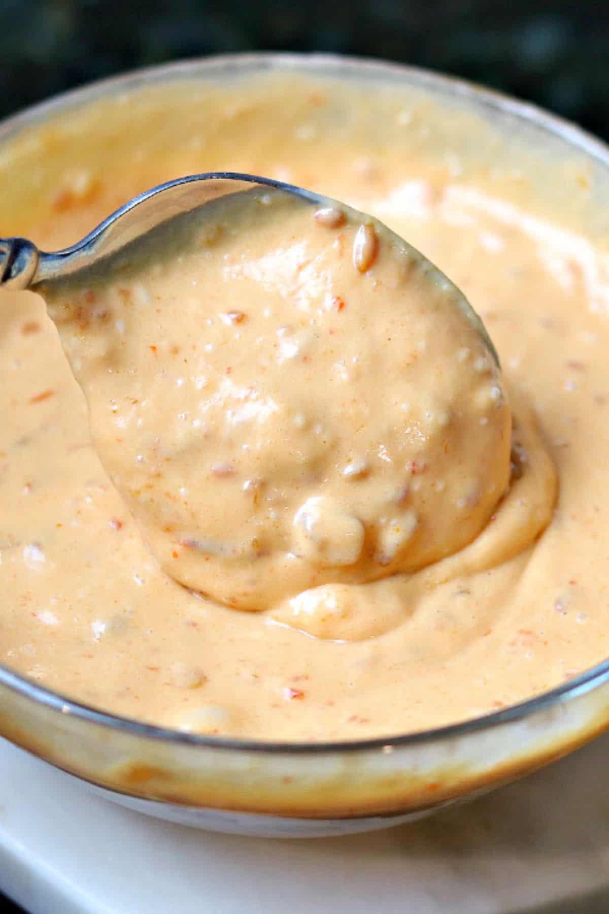 easy bang bang sauce topping in a glass bowl