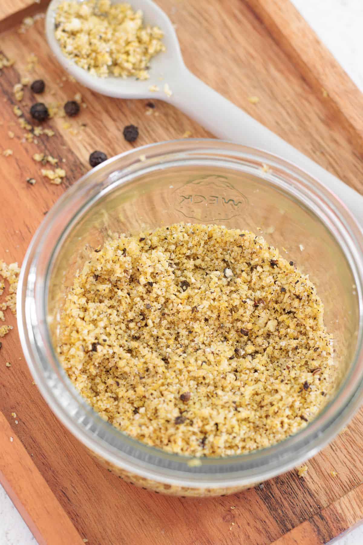Transfer the seasoning to an airtight container and keep it in a cool, dry place. Shake the jar before using since the lemon peel, pepper, and finer spices can settle over time.