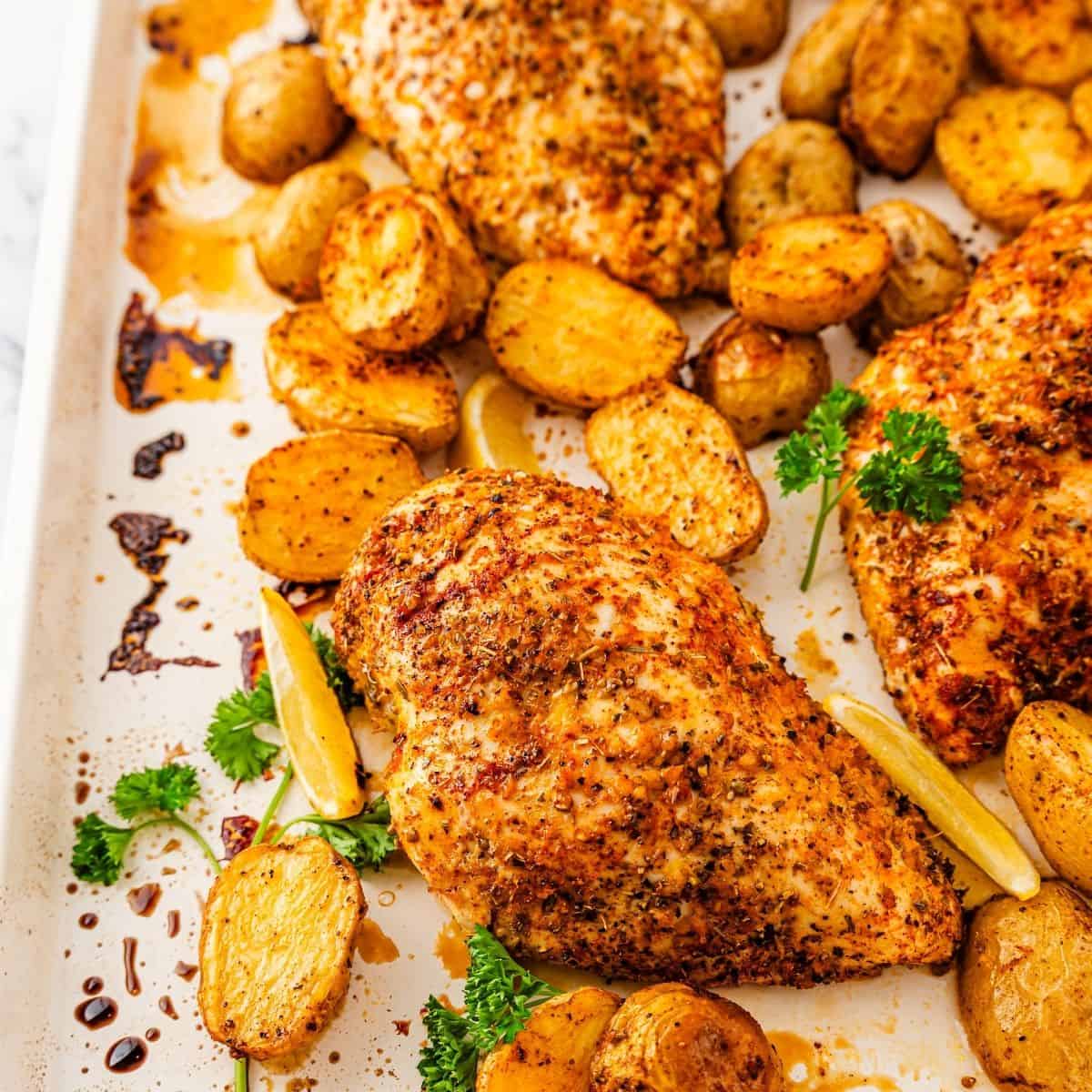 Season the chicken and potatoes well, and do not skip the lemon, garlic, and herbs. Those simple ingredients carry a lot of the flavor in a recipe like this.
