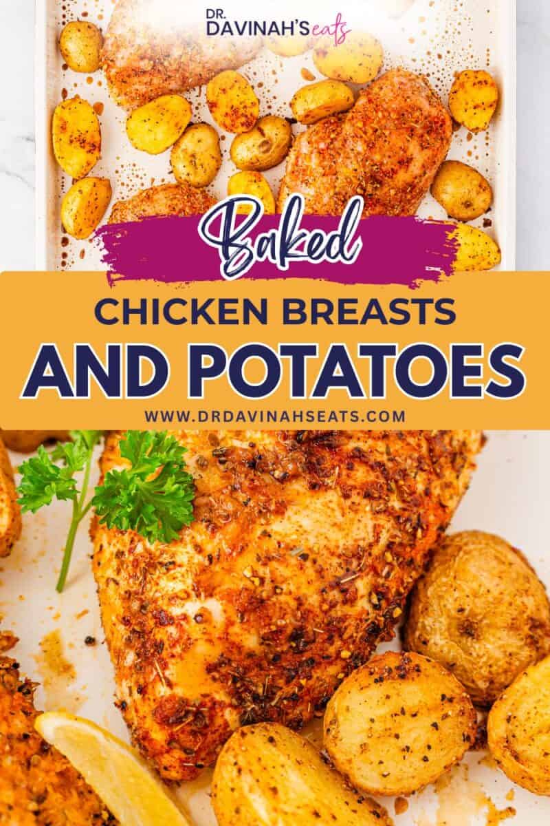 - Remove the pan from the oven and flip the potatoes. Push them slightly to the sides of the pan and place the chicken breasts in the center.