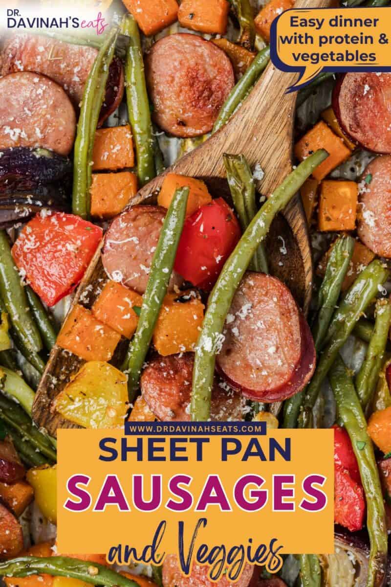 sheet pan smoked sausages with vegetables being scooped up with a wooden spatula
