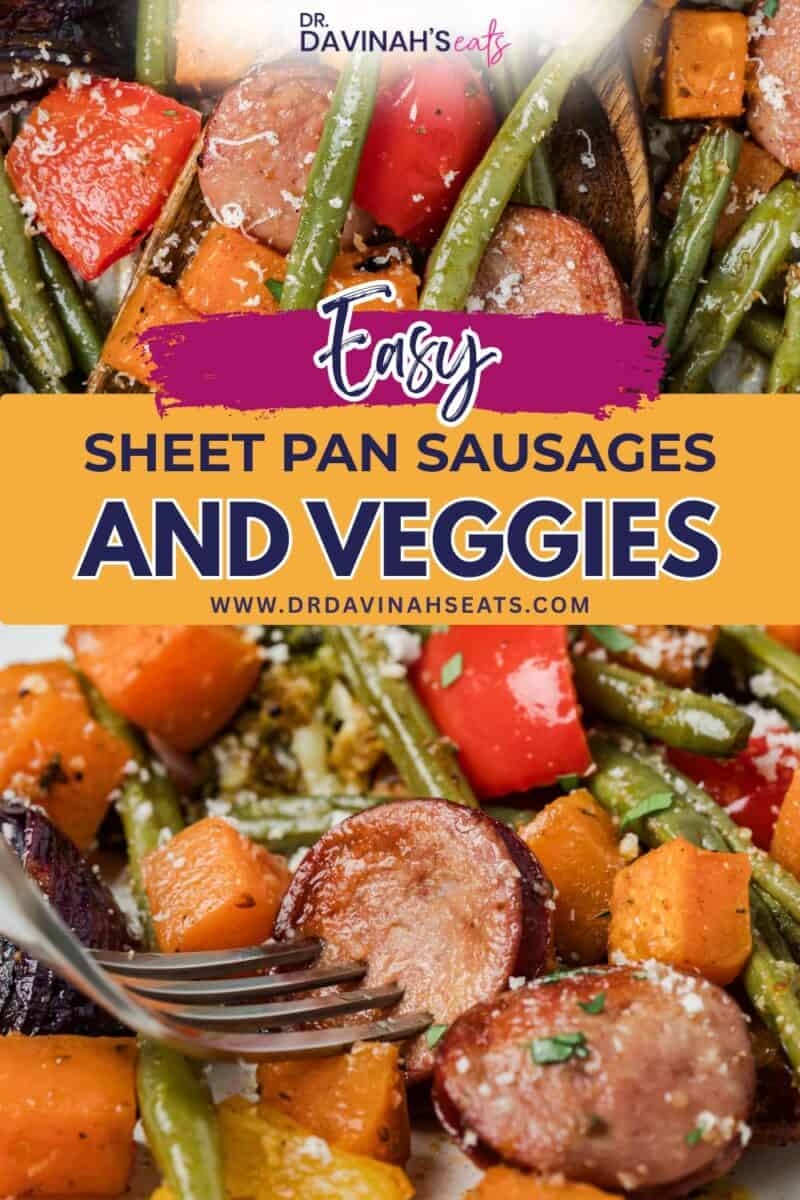 easy sheet pan sausage and vegetables recipe on a plate with a fork lifting a sausage
